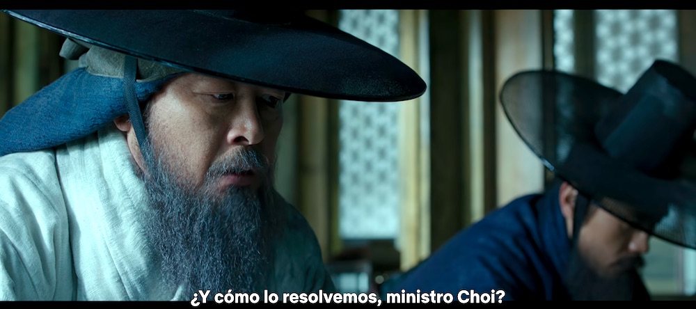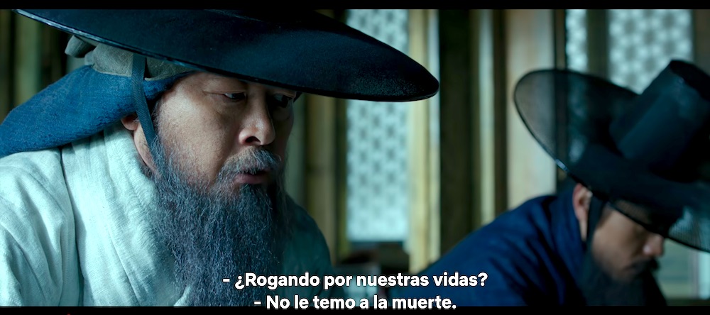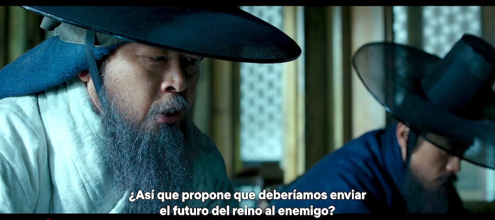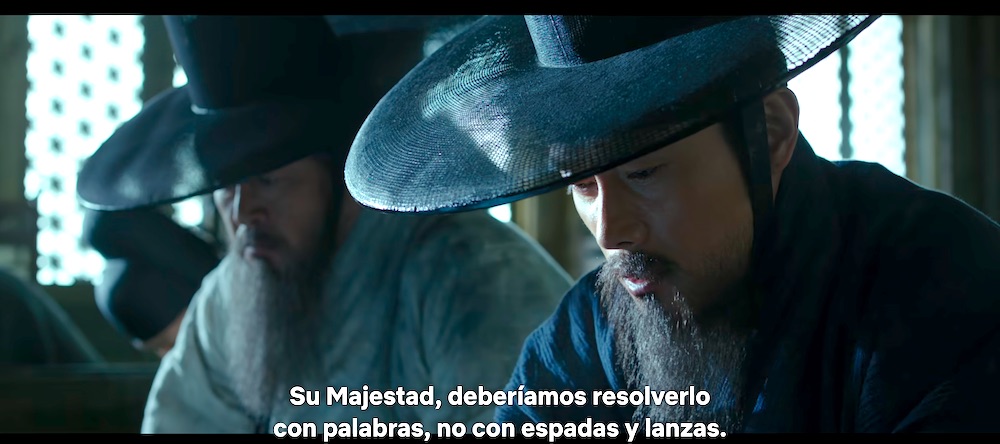 En primer lugar, es sorprendente para un argentino (acostumbrado a una historia en que los próceres o bien son incuestionables o bien se cancelan por completo), ver a grandes hombres de la historia de Corea ser representados con tantas contradicciones. Para aumentar la contradicción, Choi, el “cobarde”, es representado por Lee Byung-hun, quien es por sí mismo prácticamente un héroe nacional: protagonizó desde telenovelas, hasta cine de autor y mucho cine policial y de acción. Es también, la estrella más importante de El juego del calamar, aunque se pase todo el tiempo con una máscara. Es este rostro conocido y amado el elegido para representar al hombre que insiste, desde el primer momento, en rendirse ante los Qin. Pero tenemos que poner muchas comillas al insulto de “cobarde”, porque también él es el primero en cruzar las líneas enemigas para negociar con los invasores, en ofrecer su cabeza si eso pudiera brindar la paz, y en acompañar al rey en su momento más humillante. Por su parte, Kim es el héroe tradicional, indiscutible, el que sabe lo que hay que hacer y lo hace… pero se equivoca de forma trágica. Y además al principio de la película hace algo imperdonable. Inevitable, pero imperdonable.